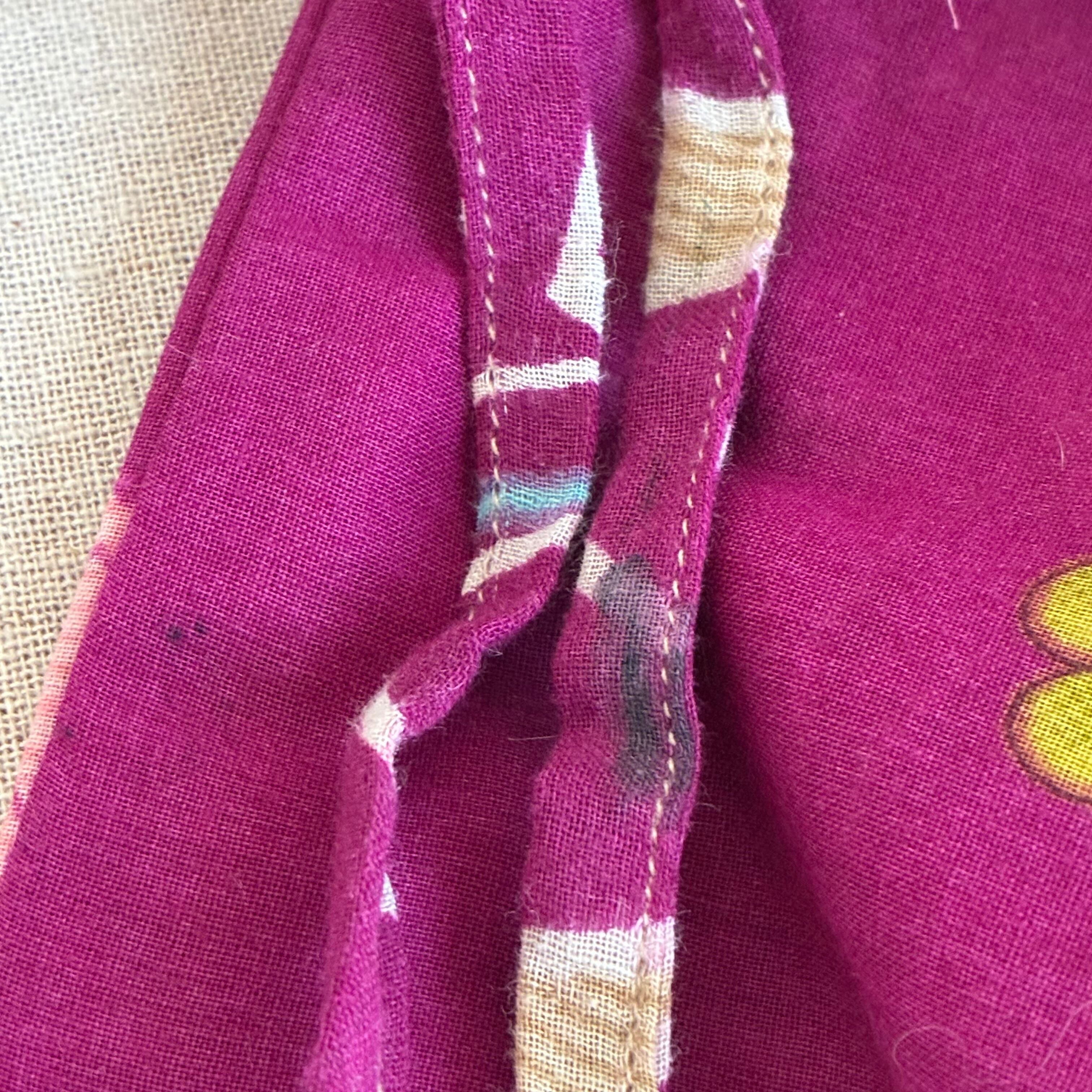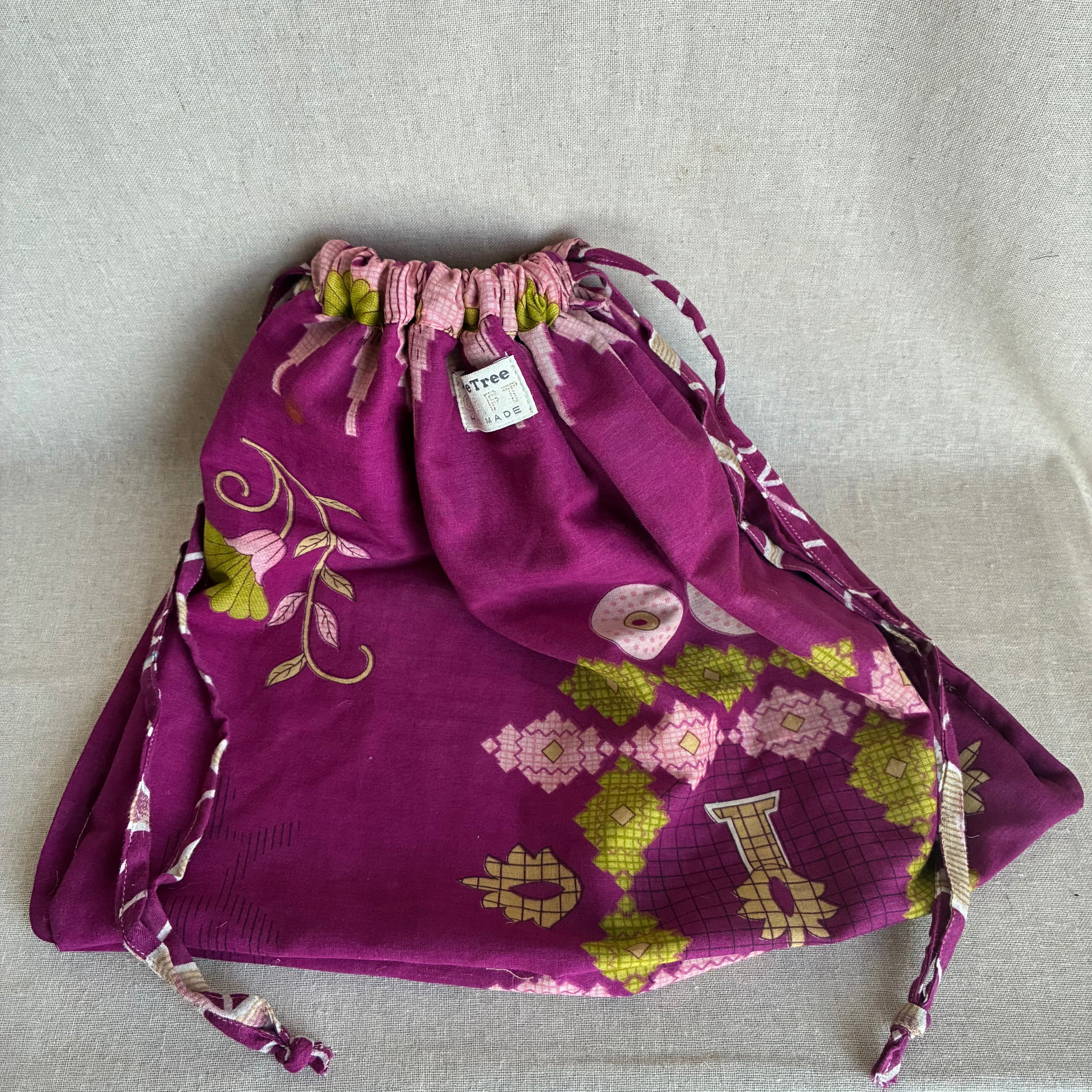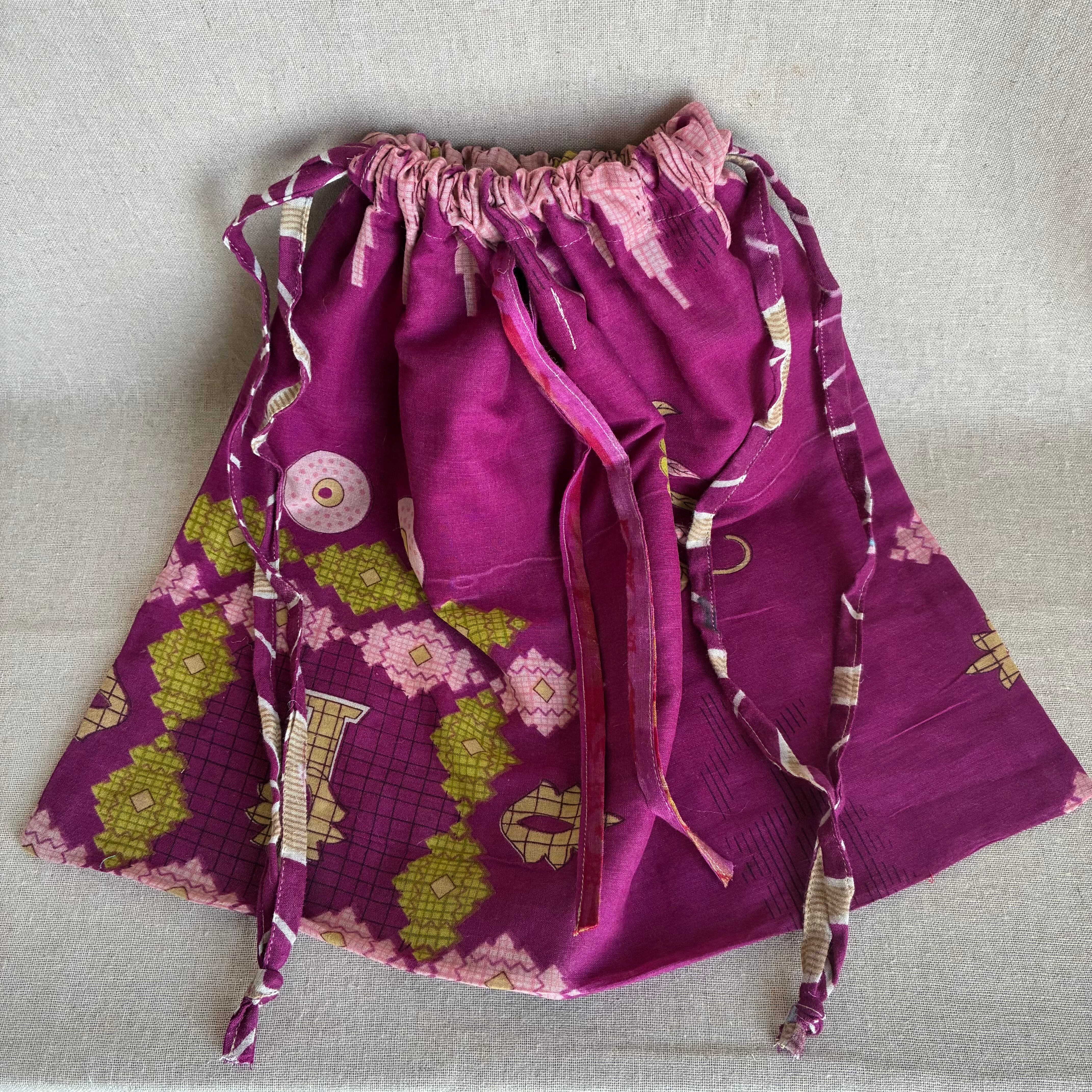 この巾着バッグは、フェアトレードに基づいて製作されたリサイクルサリーを使用しており、ひとつひとつ異なるパターンが魅力です。普段使いはもちろん、ちょっとしたお出かけにも最適。環境に配慮したアイテムをお探しの方におすすめです。