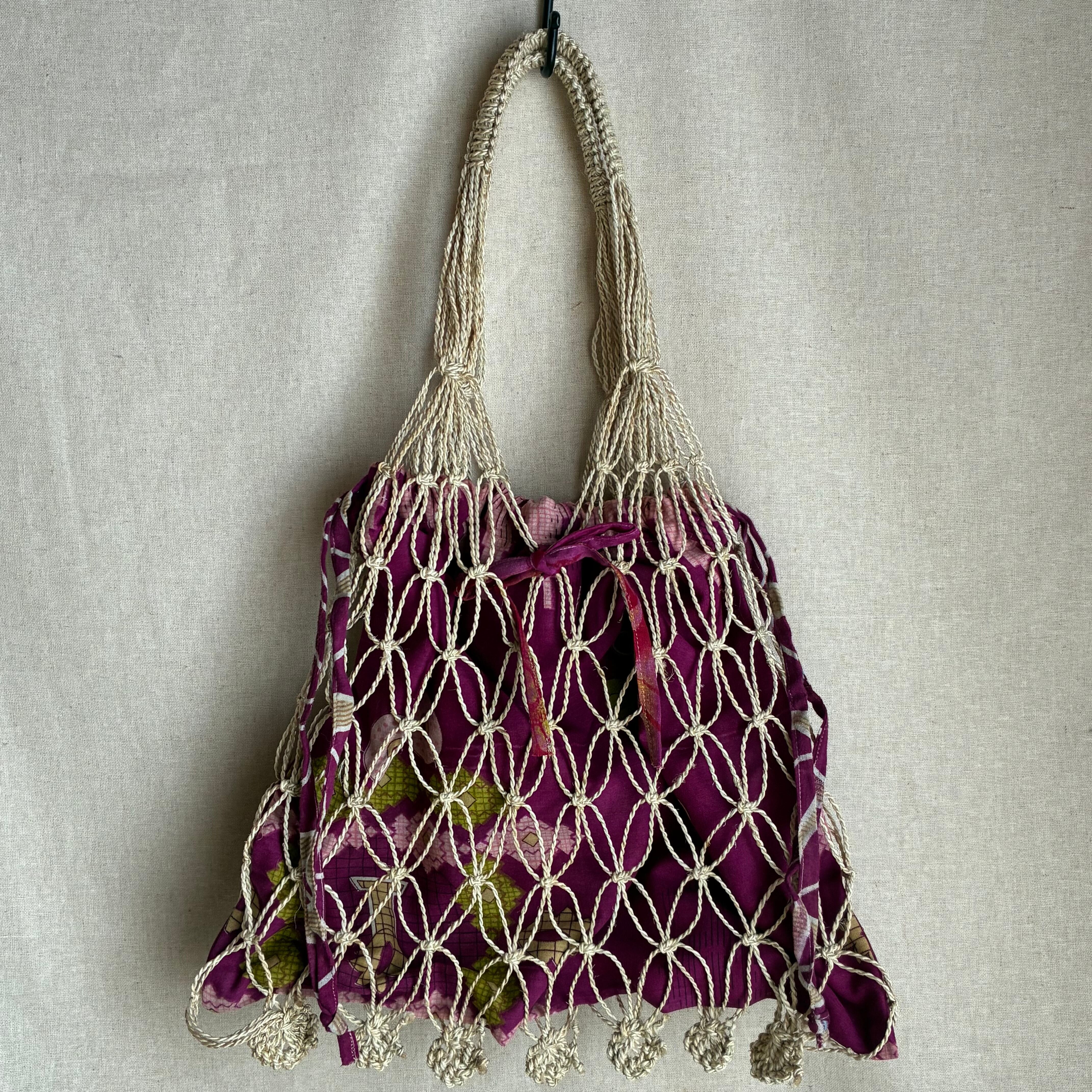 ②ジュートマクラメ&リサイクルサリー巾着バッグ パープル