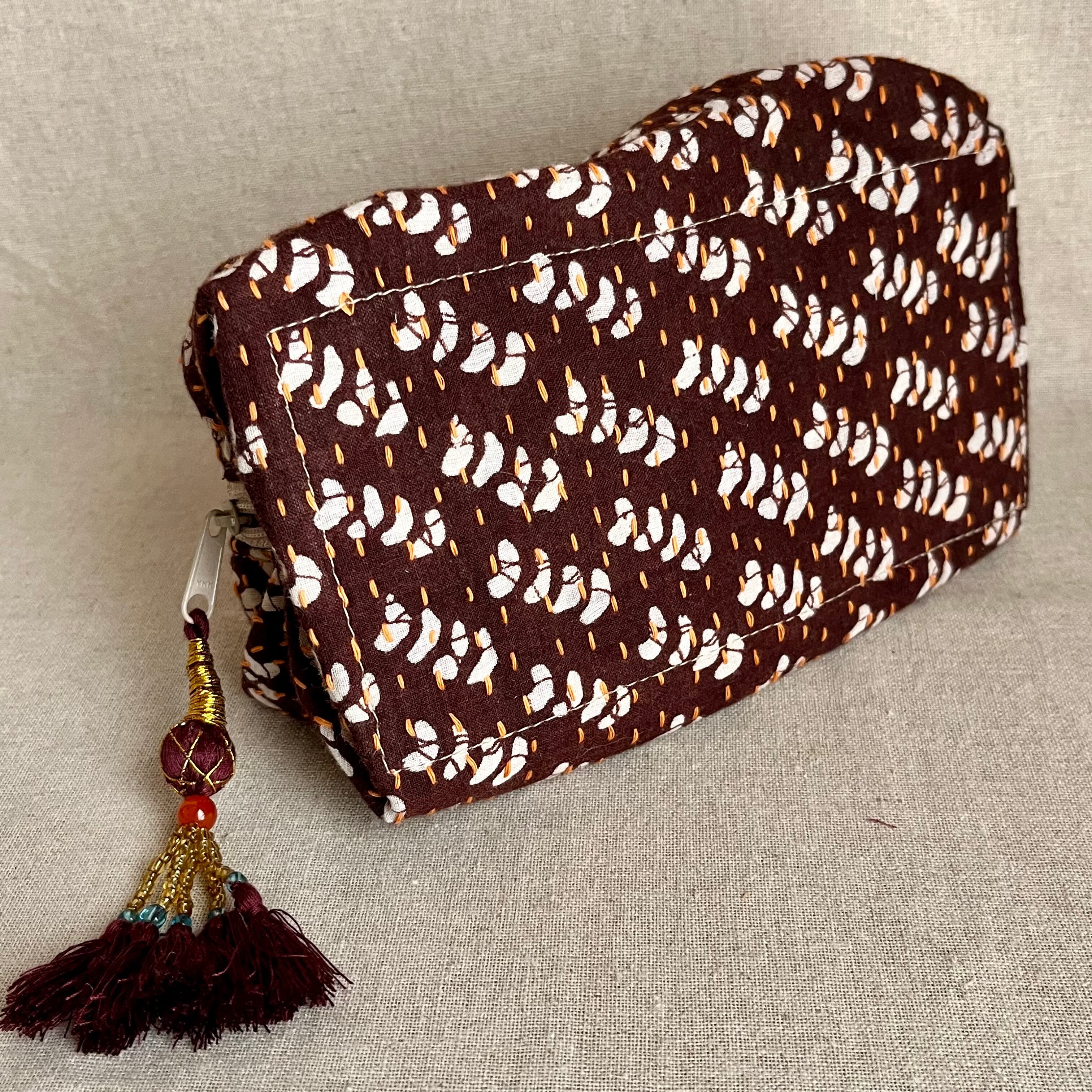 ③リサイクルサリー キャラメルポーチ ガラスビーズのタッセル付き ブラウン系