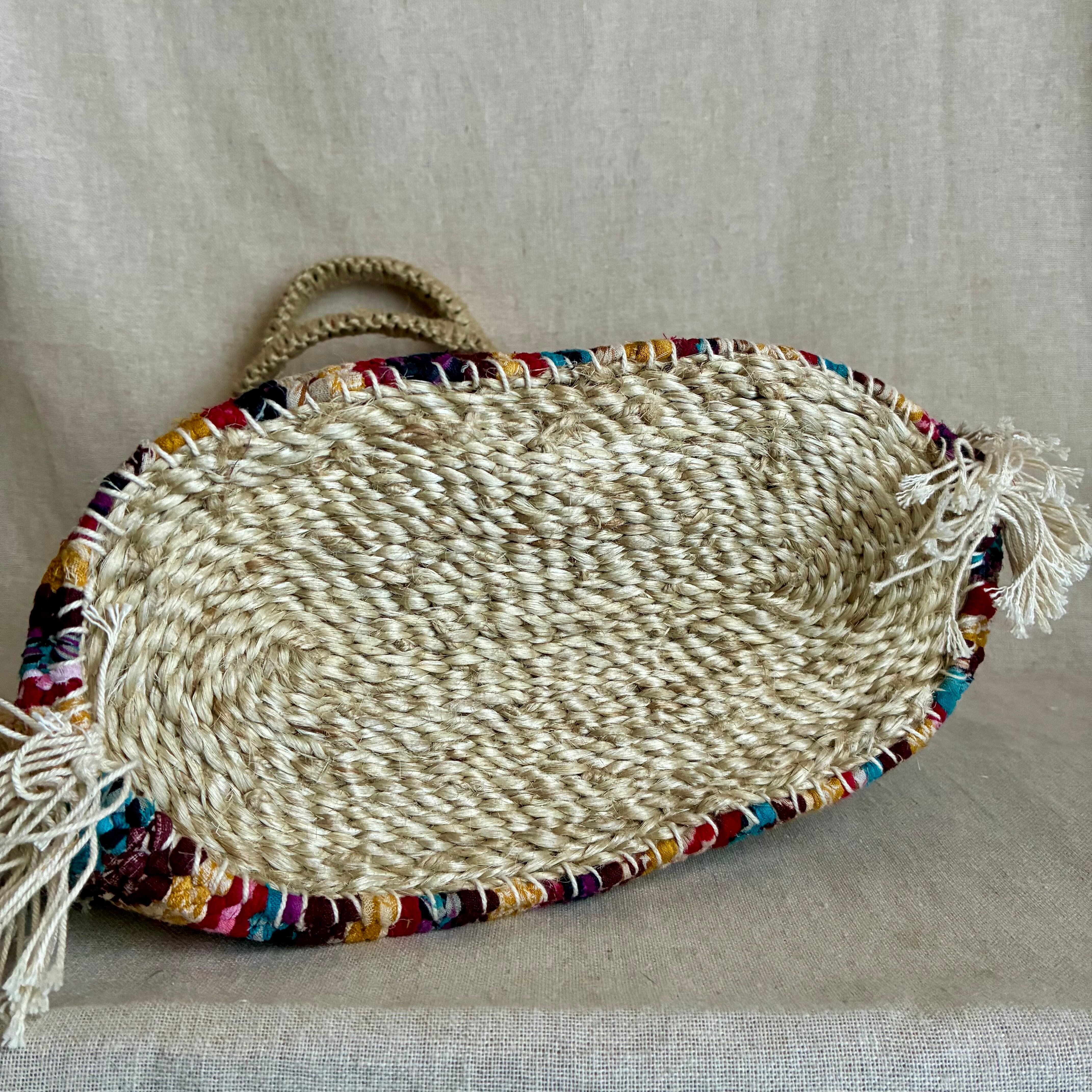 リサイクルサリーをよって紐状にして織った生地を使用していますので、色の出方がそれぞれ異なる 1点物です。