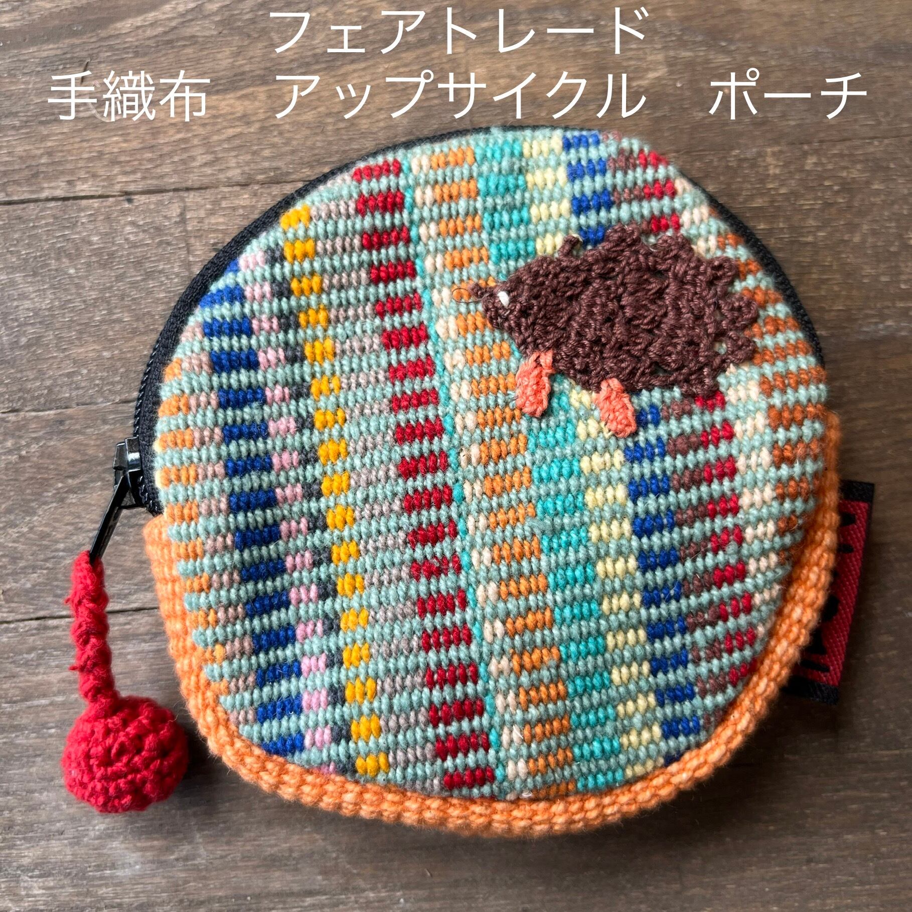 ④手織りはぎれのミニポーチ 茶色ハリネズミ マルチカラー×横糸グレー×オレンジ